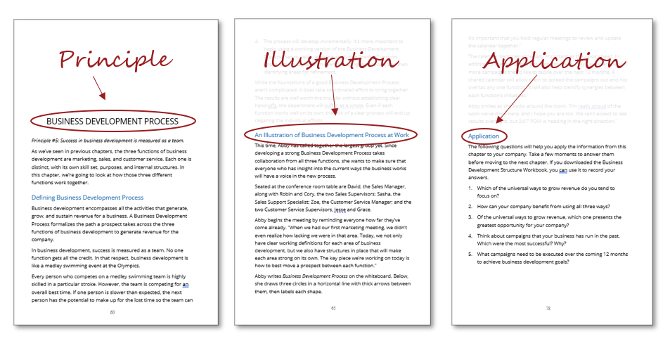 Each chapter addresses a topic related to business development. The chapter begins with an explanation of the principle that is involved and follows with examples of what it looks like when the principle is applied to a business. At the end of each chapter there is an application section with questions that will help you apply the principle to your business.