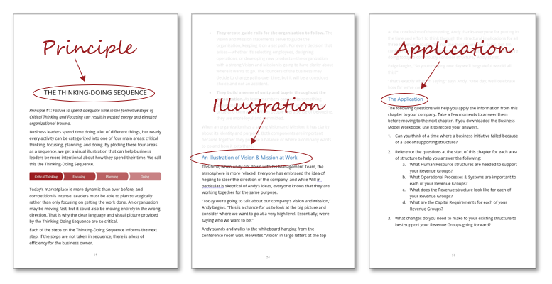 Each chapter addresses a topic related to creating a strong business model. The chapter begins with an explanation of the principle that is involved and follows with examples of what it looks like when the principle is applied to a business. At the end of each chapter there is an application section with questions that will help you apply the principle to your business.