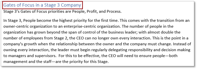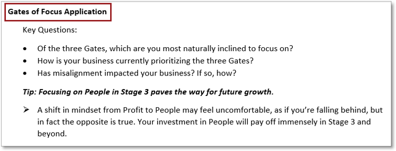 The Stages of Growth are based on the number of employees at a company. While the dimensions of a business are the same across the stages, the way the rules apply varies. Select the guidebook that corresponds with the range of employees at your business to get the rules that will best serve your needs. Not sure what stage you’re in? Click below to access the Stage Calculator and find out!