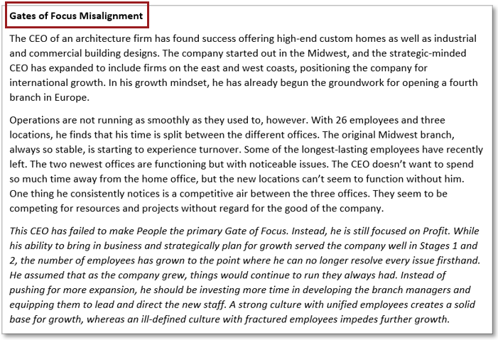 The dimensions represent an ideal. After the dimension is explained, a short story illustrates what happens when there is misalignment between a business and the dimension. The stories are useful to show how the concepts apply to commonplace scenarios and include a brief analysis of what the business could do to realign with the ideal.